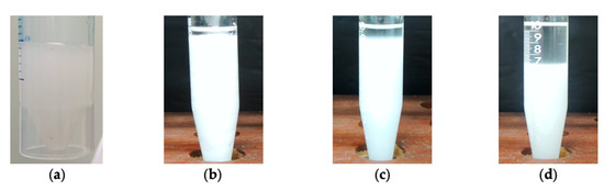 To obtain better insight into the filtration behavior of the drilling fluids, water-in-oil dispersions (water/olefin = 20/80 and brine/olefin = 40/60 and 20/80) containing CNC-g-PNIPAM2 were prepared in Ultra Turrax®. The visual aspect of the systems is displayed at Figure 8. The CNC-g-PNIPAM2 formed an opaque dispersion immediately after stirring in olefin (Figure 8a), typical of certain affinity to the nonpolar medium, due to the presence of the -CH2-CHR- main chains from PNIPAM brushes. After adding distilled water, an outstanding gelled structure was formed (Figure 8b), suggesting polymer–water hydrogen bonding due to the amphiphilic character of PNIPAM. The literature states that filtration of a polymer-based fluid through a porous medium can be considerably reduced by increasing the elastic properties of the polymer [36]. The insertion of flexible PNIPAM chain grafts in the rigid structure of cellulose nanocrystals may produce the extensional viscosity needed to support the shear imposed during the filtration process at high pressure. In addition, a thin and elastic film (filter cake) of lower permeability also formed.