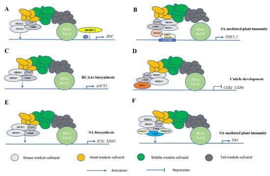 The regulatory functions of CDK8 module in biotic stress response. (A) MED12 and MED13 reactivate the expression of a silenced DNA methylated SDC gene regulated by MORC1. (B) CDK8, MED12 and MED13 subunits interact with ERF1/ORA59 to regulate the expression of PDF1.2. (C) CDK8 is involved in the induced expression of AACT1 to regulate the biosynthesis of HCAAs for biotic stress response. (D) CDK8 represses the (ECERIFERUM) CER1 and CER6 gene expression to downregulate cuticle biosynthesis through interacting with WIN1, which binds to the GCC/DRE-box [45]. (E) CDK8 subunit integrates SA signaling through activating the expression of ICS1 and EDS5. (F) CDK8, WRKY6, WRKY18, and NPR1 form a complex to regulate the expression of pathogenesis-related (PR) genes. Light gray indicates the CDK8 kinase module, yellow indicates the head module, green indicates the middle module, and dark gray indicates the tail module.