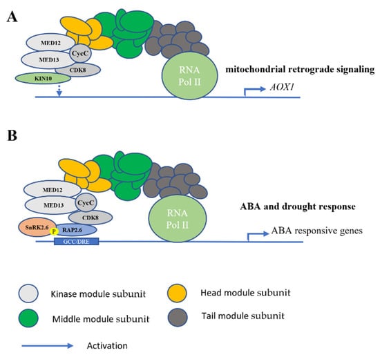 The regulatory functions of CDK8 subunit in abiotic stress response. (A) CDK8 cooperates with KIN10 to control the expression of AOX1 to regulate mitochondrial retrograde signaling. (B) CDK8 along with phosphorylated proteins of RAP2.6 and SnRK2.6 bind to the GCC/DRE-box to initiate the transcription of ABA responsive genes in response to ABA and drought stress. Light gray indicates the CDK8 kinase module, yellow indicates the head module, green indicates the middle module and dark gray indicates the tail module.