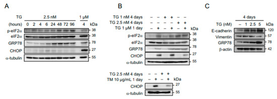 Adaptation to persistent endoplasmic reticulum (ER) stress is accompanied by phenotypic transition. (A) OECM1 cells were grown in culture media containing 2.5 nM of thapsigargin (TG) for 0 to 96 h, and time-dependent induction of ER stress response assessed by the levels of phospho-eIF2α, eIF2α, glucose-related protein 78 (GRP78), and C/EBP Homologous Protein (CHOP) were analyzed by Western blots. OECM1 cells treated with 1 µM of thapsigargin for 4 h were used as a positive control to show that ER stress signaling through CHOP in these cells is intact. (B) OECM1 cells grown in 1 or 2.5 nM of thapsigargin for 4 days were subsequently mock treated or treated with 1 µM of thapsigargin or 10 µg/mL of tunicamycin (TM) for 1 day, and the induction of ER stress response was analyzed by Western blots. (C) OECM1 cells were grown in culture media containing 0, 1, 2.5, or 5 nM of thapsigargin for 4 days, and their mesenchymal–epithelial transition was evaluated by Western blots examining the levels of E-cadherin and Vimentin. The α-tubulin and GAPDH were used as the loading control.