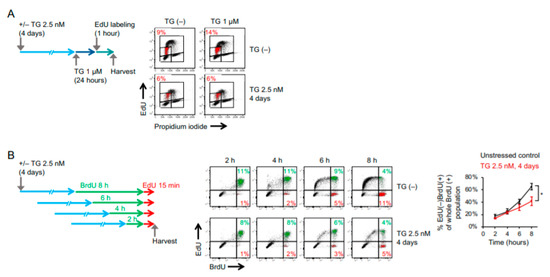 For experiments evaluating the progression of cell-cycle phases upon adaptation to ER stress, cells that had been maintained in low-dose ER stress inducers for 4 days were washed with a warm PBS with or without subsequent incubation in 1 µM of thapsigargin for 1 day, and were then incubated with media that contained 15 µM of EdU at 37 °C for 1 h. For experiments evaluating S-phase exit, cells that were treated with low-dose ER stress inducers were washed with a warm PBS, incubated with 20 µM of BrdU-containing media for 2 or up to 8 h, and immediately incubated with the 15 µM EdU-containing medium for 15 min. Cells were then harvested by trypsinization and cell suspension was centrifuged at 200× g for 5 min at 4 °C. Next, cells were resuspended in 1 mL of cold PBS, fixed with 2% paraformaldehyde at 37 °C for 10 min, centrifuged at 700× g for 5 min at 4 °C, and resuspended in ice-cold 90% methanol at room temperature for 30 min. After washing in a cold PBS, cells were stained with a 100 µL antibody dilution buffer (0.25% Tween-20-containing 1% BSA in a PBS) containing anti-BrdU mouse monoclonal (1:25, clone MoBU-1, B35141, Thermo Fisher Scientific, Waltham, MA, USA) for 1 h at room temperature. For experiments evaluating cell apoptosis, cells were stained with anticleaved Caspase 3 antibody (9661S, Cell Signaling, Danvers, MA, USA) or anti-Annexin V FITC-conjugated monoclonal antibodies (BMS147FI, VAA-33, eBioscience, San Diego, CA, USA) for 1 h at room temperature. For EdU detection, Alexa FluorTM 488 dye azide was conjugated to EdU via CuSO4-mediated Click chemistry reaction for 30 min at room temperature using Click-iT EdU Alexa FluorTM 488 dye Flow Cytometry Assay Kit (C10337, Thermo Fisher Scientific, Waltham, MA, USA; 250 µL reaction volume for one sample). For experiments evaluating the levels of cisplatin-DNA damage, cells were stained with anti-cisplatin modified DNA antibody (ab103261, Abcam, Cambridge, MA, USA). Cells were then washed with a cold PBS containing 1% FBS and resuspended in a 100 µL of antibody dilution buffer containing Alexa Fluor 647-conjugated donkey antimouse IgG (H + L) (1:800, A31571, Thermo Fisher Scientific, Waltham, MA, USA) for 30 min at room temperature. For samples that were stained with BrdU alone, cells were resuspended in a 200 µL of PBS containing 2 µg of propidium iodide (PI; P4170, Sigma-Aldrich, St. Louis, MI, USA) and 100 µg of RNase A (19101, Qiagen, Hilden, Germany). For experiments evaluating the levels of ROS, MitoSOXTM Red Mitochondrial Superoxide Indicator (M36008, Thermo Fisher Scientific, Waltham, MA, USA) was used. Cells were washed twice, resuspended in a 200 µL PBS, and analyzed on a FACSCanto II Flow Cytometer (BD Biosciences), and the acquired data were analyzed using FlowJo version 9 (Tree Star).