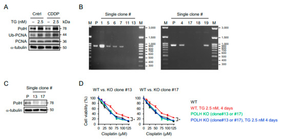 Since polymerase η encoded by POLH has been linked to cisplatin resistance [20,21,22], we sought to determine whether ER stress-induced cisplatin resistance is indeed mediated by polymerase η. As show in Figure 5A, the levels of polymerase η and the ubiquitination of proliferating cell nuclear antigen (PCNA) (a processivity factor for DNA polymerase’s recruitment upon ubiquitination) were increased by prolonged ER stress. Notably, the cisplatin alone had no inductive effect on polymerase η or the ubiquitination of PCNA. To further investigate the role of polymerase η in cisplatin resistance, we created POLH-knockout cells by the employing clustered, regularly interspaced, short palindromic repeat RNA-guided (CRISPR)/Cas9 system with two separated sgRNAs targeting the sequences before exon 2 and at the end of exon 3 of the POLH to delete a gene segment containing an ATG start codon. Using primers designed to amplify the region flanked by these two sgRNA docking sites, the PCR only amplified the wild-type allele (916 bp). As a result, the single-cell clones (#11, 13, 17, and 18) with deletions of POLH were identified by a complete lack of PCR products (Figure 5B), and the subsequent Western blot analysis further revealed minimal expression of the polymerases η in two POLH-knockout clones (Figure 5C). Importantly, while the wild-type cells became more resistant to cisplatin after a prolonged pretreatment with the ER stress inducer, the POLH-knockout cells with and without the induction of ER stress exhibited similar sensitivities to cisplatin (Figure 5D), suggesting that the protective effect of adaptive ER stress response on cisplatin-induced cytotoxicity was abrogated by the knockout of polymerase η. Since DNA polymerases are mostly active during DNA synthesis, we used EdU to label replicating cells and examined whether the protective effect is induced mainly in S-phase cells. Intriguingly, a reduction in cleaved Caspase 3 (+) population was observed not only in EdU-labeled cells but also EdU-unlabeled cells (Supplementary Figure S2). Accordingly, the protection from cisplatin cytotoxicity is not restricted to the replicating cells, and additional mechanisms are likely involved in the ER stress-mediated cisplatin resistance.