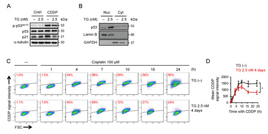 The cells that had been maintained in cell culture media with or without 2.5 nM of thapsigargin were trypsinized and seeded on 4-well chamber slides (154941, LAB-TEK) at a density of 3.5 × 104 cells per well. After 18 to 24 h, cells were washed with a warm PBS and incubated in cell culture media containing 50 to 100 µM of Cisplatin-Texas Red conjugate for 24 h. Cells were then fixed with 4% paraformaldehyde for 10 min at room temperature, and subsequently permeabilized using 0.05% Trion-X100 in a PBS for 5 min. For TP53 staining, the antibody (175933, Abcam) was used. Cells on chamber slides were washed and the nuclei were counterstained with 4′,6-diamino-3-phenylidole, dihydrochloride (DAPI, #D1306, Thermo Fisher Scientific, Waltham, MA, USA) and examined using an Olympus FV1000 confocal microscope.