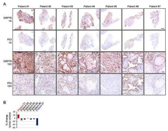 The pattern and intensity of GRP78 positivity coincides with nuclear p53 on immunostaining and is associated with the response to cisplatin-based chemotherapy. (A) Whole biopsies and representative GRP78 and p53 immunostaining of specimens of oral cancers taken before cisplatin-based induction chemotherapy. Dominant p53 nuclear staining coincides with the area of strong GRP78 positivity except for patient #5. (B) The percentage of relative tumor volume change of patients after two courses of induction chemotherapy. Patient #1 shows progression (23%) and patient #7 shows regression (45%) markedly after treatment. Scale bar: 2 and 0.1 mm for 1× and 15×, respectively.