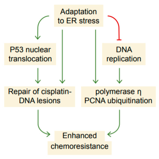 Proposed schematic depicting the enhancement of chemoresistance as a consequence of adaptation to ER stress. The adaptive ER stress response is accompanied by a suppression of DNA replication and cell-cycle progression that, to some extent, resembling the response to replication stress. As a result, cells promote the expression of polymerase η and nuclear translocation of p53, which may possibly increase the efficiency of translesion synthesis and DNA repair, leading to enhanced chemoresistance.