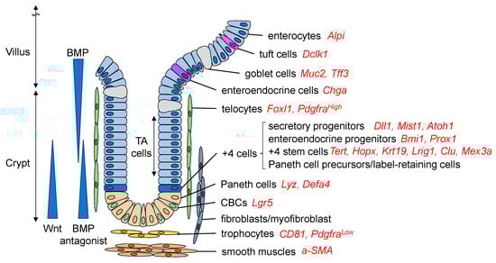 Intestinal stem cells are supported by the surrounding niche cells to maintain their proliferative, self-renewing ability. Multiple cell types contribute to the stem cell niche (Figure 1). Paneth cells, interspersed between Lgr5+ CBC cells, play a role in mucosal immune defense and act as niche cells by secreting several growth factors, such as Egf, Tgf-a, Wnt3, and Notch ligand Dll4, all of which activate critical signals for stem cell maintenance [9]. Nevertheless, even if Paneth cells are ablated, intestinal homeostasis is not impaired, as other niche cells, such as tuft cells, enteroendocrine cells, and stromal cells, can compensate for the loss of Paneth cells [9,10,11]. The stromal cells play essential roles as stem cell niches. The major intestinal stromal subsets are classified as fibroblasts, a-smooth muscle actin (a-SMA)-expressing myofibroblasts, and perivascular pericytes [12,13]. Studies using in situ hybridization revealed that many Wnt ligands, such as Wnt-2b, Wnt-4, Wnt-5a, and Wnt-5b, as well as R-spondins, are expressed in the stroma to support ISCs (Figure 2) [14,15]. Foxl1+ telocytes, a small subset of fibroblasts, are one of the important sources of Wnts, and the ablation of telocytes inhibited the proliferation of ISCs, which was associated with a loss of active Wnt signaling [16,17]. Recent studies have revealed more detailed subsets among these stromal cell types, showing that Foxl1+PdgfraHigh telocytes secrete Wnt ligands, R-spondins, and BMPs, while CD81+PdgfraLow trophocytes at the crypt bottom secrete BMP antagonists and gremlin 1 to maintain WNT signaling [18,19].