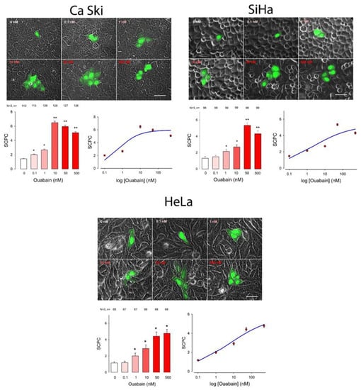 Effect of ouabain on gap junctional intercellular communication (GJIC) of cervico-uterine cancer cell lines (CasKi, SiHa and Hela). Each set shows, in the top part: representative images comparing the number of stained cell per cluster (SCPC) after one of them had been injected with Lucifer Yellow, from monolayers that were either untreated (0 nM) or treated for one hour with ouabain in the concentration indicated (nM). In the bottom part: (Left) Histogram showing the average (± SE) SCPC in monolayers of confluent cells that were treated with ouabain, for one hour, in the concentrations indicated at the bottom of the bars. At the top of each bar the number of repeats after three independent trials is shown. Asterisks indicate a statistically significant difference compared to the control group, (Dunn’s method), * indicates p < 0.05, ** indicates p < 0.001. Scale bar length = 100 µM. (Right) A semi-log plot shows mSCPC ± SE (red) and the curve (blue) resulting after fitting data to a logistic equation.