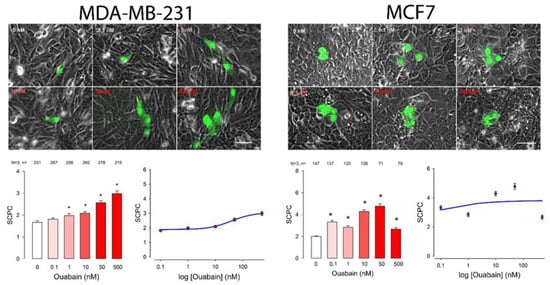Effect of ouabain on GJIC of breast cancer cell lines (MDA-MB-231 and MCF7). Each set shows, in the top part: representative images comparing the number of stained cell per cluster (SCPC) after one of them had been injected with Lucifer Yellow in monolayers that were either untreated (0 nM) or treated for one hour with ouabain in the concentration indicated (nM). In the bottom part: (Left) Histogram showing mSCPC (± SE) in monolayers of confluent cells that were treated with ouabain, for one hour, in the concentrations indicated at the bottom of the bars. At the top of each bar the number of repeats after three independent trials is shown. Asterisks indicate a statistically significant difference compared to the control group, (Dunn’s method), * indicates p = < 0.05. Scale bar length = 100 µM. (Right) A semi-log plot shows, the average data and the curve (blue) resulting after fitting data to a logistic equation.