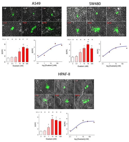 Effect of ouabain on GJIC in lung (A549), colon (SW480) and pancreas (Hpaf-II) cell lines. Each set shows, in the top part: representative images comparing the number of stained cell per cluster (SCPC) after one of them had been injected with Lucifer Yellow in monolayers that were either untreated (0 nM) or treated for one hour with ouabain in the concentration indicated (nM). In the bottom part: (Left) Histogram showing the mSCPC (± SE) in monolayers of confluent cells that were treated with ouabain, for one hour, in the concentrations indicated at the bottom of the bars. At the top of each bar the number of repeats after three independent trials is shown. Asterisks indicate a statistically significant difference compared to the control group, (Dunn’s method), * indicates p = < 0.05, ** indicates p = < 0.005). Scale bar length = 100 µM. (Right) A semi-log plot shows, the average data and the curve (blue) resulting after fitting data to a logistic equation.
