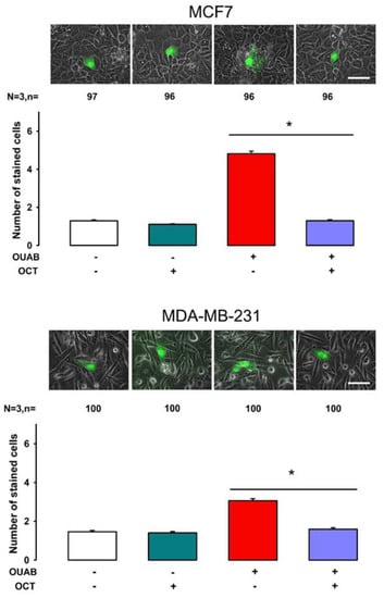 Octanol suppresses the enhancement of GJIC by ouabain. The effect of octanol was assayed in MCF7 (upper) and MDA-MB-231 (lower). The bar chart compares mSCPC (±SE) obtained after three independent trials of dye transfer assays, cells were treated in the conditions indicated at the bottom part of each bar. A representative image of each treatment is shown above the bars. The numbers above each bar indicate the total number of repeats. Asterisks indicate a statistically significant difference (Mann—Whitney Rank Sum Test. * indicates p < 0.05). Scale bar = 100 µm.