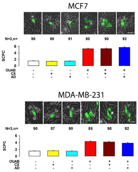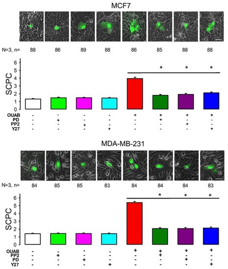 We assayed the effect of these inhibitors in MCF7 and MDA-MB-231 cells. As shown in Figure 6, the mSCPC after three independent trials were, for MDA: the control (1.3 ± 0.1, n = 88), PD (1.5 ± 0.1, n = 86), PP2 (1.5 ± 0.1, n = 89), Y27 (1.4 ± 0.1, n = 88); ouabain (4.1 ± 0.2, n = 86), ouabain + PD (1.8 ± 0.1, n = 85), ouabain + PP2 (1.9 ± 0.1, n = 88), ouabain + Y27 (2.1 ± 0.1, n = 88). For MCF7: the control (1.4 ± 0.1, n = 84), PD (1.4 ± 0.1, n = 85), PP2 (1.4 ± 0.1, n = 84), Y27 (1.4 ± 0.1, n = 83), ouabain (5.4 ± 0.2, n = 84), ouabain + PD (2.1 ± 0.1, n = 83), ouabain + PP2 (2.1 ± 0.1, n = 84), ouabain + Y27 (2.2 ± 0.1, n = 83).