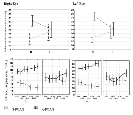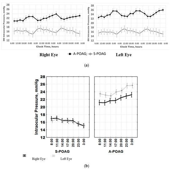 For further chronobiological studies, 115 (65 S-POAG and 50 A-POAG) patients, matched by gender, age and treatment modalities (Table S1), were selected. All POAG patients selected for chronobiological studies received local anti-hypertensive treatment (prostaglandin F2α analogues, β-blockers, carbonic anhydrase inhibitors) or underwent previous surgery with non-penetrating deep sclerectomy or sinustrabeculectomy. The exclusion criteria were the following: primary open-angle glaucoma of the end stage; other types of glaucoma; severe scarring of the cornea; severe cataract; hereditary eye diseases, inflammatory eye diseases; high-degree myopia; occlusion of the central artery/central retinal vein; and age-related central retinal degeneration. Excluded were also patients with acute coronary or cerebral blood flow disorders; heart rhythm disorders; cancer; mental diseases, including alcohol use disorder; neurodegenerative diseases, such as Alzheimer’s, Parkinson’s, and multiple sclerosis; diabetes mellitus; thyroid disease; shift workers; and patients crossing time zones at least once a month.