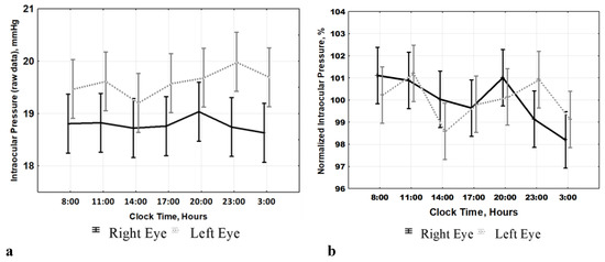 An elevated intraocular pressure (IOP) is an important clinical symptom of glaucoma. “Elevated” needs to be qualified, however, since IOP undergoes a circadian (about 24-h) variation. Because IOP is measured using different methods, under different experimental conditions and health status, there is no consensus regarding the circadian characteristics of IOP. In part, ambiguities stem from reported differences in the kind and degree of severity of glaucoma. Multiple exogenous factors, such as posture, physical activity, and diet [1,2,3,4], affect IOP, including whether it is measured at home or in a hospital setting [5]. Not only does the 24-h IOP average, but also its circadian amplitude and phase characteristics depend on age [1,2,6,7], body and head position [6,7], methods of measurement, and different forms of glaucoma [8]. Three approaches currently exist to evaluate IOP: (1) office IOP; (2) self-tonometry; and (3) contact lens sensor monitoring (CLS). The different methods have both pros and cons. IOP measured in the clinic is most rigorously studied in large cohorts but suffers from the inherent unavailability of nighttime data. Measurements outside office hours are possible by self-tonometry, but sampling has remained scarce and limited. Dense sampling, also during sleep, is readily obtained by CLS monitoring. Many studies based on office measurements or self-tonometry showed that, in healthy humans, IOP peaks in the morning or early during the daytime hours [7,8,9,10,11]. Controlled laboratory studies on young healthy volunteers in either a constant supine position [12] or a constant sitting position [13] showed an early morning phase, with propensity to a nocturnal phase in a substantial percentage of individuals. The recently introduced contact-lens-sensor monitors may resolve inconsistencies in the determination of the phase position of the 24-h IOP rhythm in clinical health. With this method, IOP typically follows a sinusoidal pattern peaking during the night [14,15,16,17], but IOP is estimated in millivolts (mV) rather than in mmHg. CLS monitors fluctuations related to IOP in the circumferential curvature of the corneoscleral region via an electric signal sensing-resistive strain [2]. Studies comparing IOP obtained simultaneously by CLS and with a pneumatometer bilaterally in two random eyes showed a similar nocturnal phasing [18]. However, 24-h variations of the two eyes in the same patients measured by these techniques were not correlated, prompting the authors to conclude that the two devices should not be considered to be interchangeable, and that current CLS technology does not yet provide a reliable estimate of 24-h IOP variability [2,18]. To summarize, neither the “ideal technology” for IOP surveillance, nor a perfect algorithm for decision making in interpreting IOP variability is currently established [2]. Additionally, reference standards for IOP parameters have not yet been established.