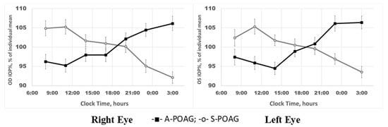 The first confounder can be eliminated by normalizing the raw data by expressing them as percentages of individual IOP mean values as described in Methods. A significant time effect was indeed found by ANOVA for the entire POAG cohort once the normalized data are analyzed (right eye: F(6, 2408) = 2.889, p = 0.008; left eye: F(6, 2408) = 2.072, p = 0.053), confirming that IOP varies along the 24-h scale, Figure 2b. The second factor became obvious after running a two-way ANOVA: the time*group interaction provides evidence that the time patterns of the S-POAG and A-POAG groups were distinctively different. This significant time*group interaction was found when analyzing the data over the 72-h span (right eye: F(20, 2373) = 4.247, p < 0.0001; left eye: F(20, 2373) = 4.385, p < 0.0001), Figure 2a, or after stacking the data over a 24-h span (right eye: F(6, 2401) = 51.52, p < 0.0001; left eye: F(6, 2401) = 45.99, p < 0.0001), Figure 3.