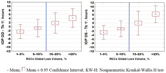 Another point is that ipRGC loss was not specifically analyzed in our study. A previous study confirmed that ipRGC loss is indeed evident in glaucoma, affecting sleep quality [27]. Another histological study demonstrated that ipRGC loss likely occurs in advanced rather than in mild glaucoma [28]. Furthermore, since the ensemble of cells within the retinal system clearly displays inter-dependency [45], damage and dysfunction of not just ipRGCs may have certain consequences regarding circadian alignment. Herein, there were unfortunately no participants with a mean GLV between 10% and 15%. Including this group in future studies could be interesting to investigate the phase behavior of IOP since the putative threshold for abrupt changes is situated within this range.