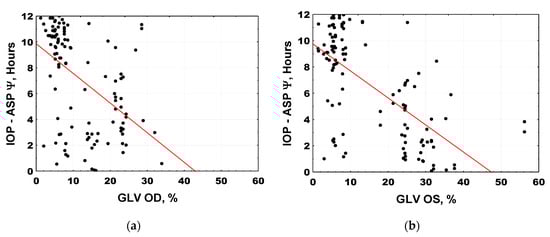 Progressive IOP-to-ASP circadian phase shift (IOP phase propensity to sleep mid-phase) is associated with higher retinal ganglion cell global loss volume (GLV); right eye (OD): r = −0.489, p < 0.0001; left eye (OS): r = −0.653, p < 0.0001. ψ—intrinsic phase angle between respective eye IOP and ASP; ASP—average sleep phase. Global Loss Volume (GLV%) of the right eye (OD)(a), Global Loss Volume (GLV%) of the left eye (OS) (b).