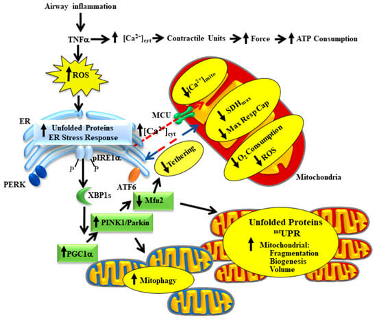Airway inflammation underlies a number of pathological conditions such as asthma, chronic obstructive pulmonary disease (COPD), chronic bronchitis, COVID-19 and various cough syndromes. With the COVID-19 pandemic, we are keenly aware of the detrimental impact of airway inflammation and acute respiratory distress syndrome (ARDS). Even before COVID-19, ARDS affected as many as 246,000 people in the USA each year (based on an incidence rate of ~75 per 100,000), with influenza and the common cold affecting many more. The effects of acute airway inflammation are mediated by pro-inflammatory cytokines (e.g., tumor necrosis factor alpha, TNFα) leading to increased contractile protein expression, increased force generation and increased ATP consumption in airway smooth muscle (ASM) [,]. In humans, the increase in ATP consumption in ASM is matched by increased mitochondrial O2 consumption at the expense of increased reactive oxygen species (ROS) formation (oxidative stress) []. The subsequent oxidative stress results in an accumulation of unfolded proteins in the endoplasmic reticulum (ER) and in mitochondria triggering unfolded protein responses in both organelles. In a recently published study, we demonstrated that TNFα selectively activates the inositol-requiring enzyme 1 alpha (pIRE1α) mediated ER stress pathway in human ASM, which induces alternative splicing of mRNA for the transcription factor X-box binding protein 1 (XBP1s) []. In a follow-up study, we showed that 24 h TNFα exposure increases the expression of peroxisome proliferator-activated receptor-gamma coactivator 1 alpha (PGC1α) in human ASM cells, thereby promoting mitochondrial biogenesis and an increase in mitochondrial volume density []. The TNFα induced increase in PGC1α and mitochondrial remodeling could be downstream to either ER stress or the mitochondrial unfolded protein response (mtUPR) [,]. In addition to playing a key role in mitochondrial biogenesis, PGC1α also activates the Phosphatase and tensin homolog (PTEN)-induced putative kinase 1 (PINK1)/Parkin mitophagy pathway, which is involved in the ubiquitination of the mitochondrial fusion protein Mfn2 [,]. Accordingly, we found that acute exposure to TNFα also results in a decrease in mitofusin 2 (Mfn2) protein levels in human ASM cells while expression of dynamin-related protein-1 (Drp1) increases, resulting in mitochondrial fragmentation [,,]. In addition to promoting mitochondrial fusion, Mfn2 also plays an essential role in tethering mitochondria to the ER, thereby establishing the proximity of mitochondria to ER Ca2+ release sites that represent microdomains of higher cytosolic Ca2+ concentrations ([Ca2+]cyt “hotspots”) [,,,]. In another study, we reported that acute TNFα exposure disrupts the tethering of mitochondria to the ER and reduced mitochondrial Ca2+ influx through the mitochondrial Ca2+ uniporter (MCU) []. This is consistent with other studies showing that close proximity of mitochondria to the ER is necessary to open the MCU and thereby promote mitochondrial Ca2+ influx [,,,]. In this review article, we provide a conceptual framework for a homeostatic response triggered by activation of the pIRE1α/XBP1s ER stress pathway, which serves to mitigate the impact of TNFα-induced ER stress by promoting mitochondrial biogenesis, reducing mitochondrial Ca2+ influx and thereby limiting ROS formation (Figure 1). Components of this homeostatic response include a pIRE1α/XBP1s-mediated increase in PGC1α and an increase in PINK1/Parkin leading to: (a) a reduction in Mfn2 and restricted tethering of mitochondria to the ER, and (b) mitochondrial biogenesis leading to an increase in mitochondrial volume density, which reduces O2 consumption and ROS formation per mitochondrion, while still meet the increased ATP demand of force generation.