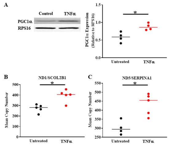 Compared to untreated controls, TNFα (20 ng/mL, 24 h) increases PGC1α protein expression in human ASM (A) and mitochondrial DNA copy number (B,C), indicating an increase in mitochondrial biogenesis. (* denotes a significant difference between TNFα treated and untreated control groups; p < 0.05; t-test; cells were dissociated from ASM samples from n = 5 patients and divided into TNFα treated and untreated control groups). All data are presented as scatter plots with the lines indicating the mean values. These figures are modified from presentations of previously reported results [].