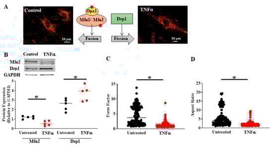 Compared to untreated controls, TNFα (20 ng/mL, 24 h) exposure induced mitochondrial fragmentation in human ASM (A) associated with reduced Mfn2 and increased Drp1 protein levels (B). The extent of mitochondrial fragmentation was assessed by calculating (C) form factor and (D) aspect ratio of mitochondria labeled using MitoTracker Red (A). In B, cells were dissociated from ASM samples from n = 5 patients and divided into TNFα treated and untreated control groups. In C and D, multiple mitochondria/cells were measured from ASM cells isolated from n = 5 patients divided into TNFα treated and untreated control groups. (* denotes a significant difference between TNFα treated and untreated control groups; p < 0.05; t-test). All data are presented as scatter plots with lines indicating mean values. These figures are modified from presentations of previously reported results [].
