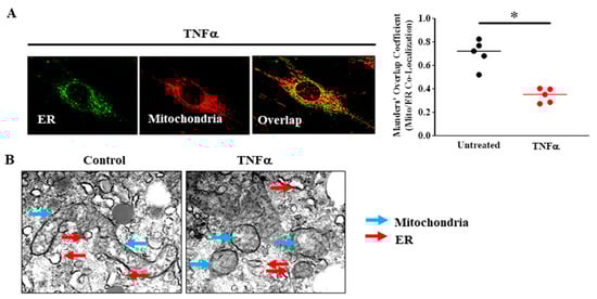 (A) In human ASM cells, ER was labeled using BODIPY FL thapsigargin (endoplasmic reticulum Ca2+ pumps, green) and mitochondria were labeled using MitoTracker red and imaged in 3D by confocal microscopy. Proximity of mitochondria to the ER was determined by measuring the Manders’ overlap co-efficient. Acute TNFα exposure (20 ng/mL, 24 h) reduced proximity of mitochondria to the ER (* denotes a significant difference between TNFα treated and untreated control groups; p < 0.05; t-test; cells were dissociated from ASM samples from n = 5 patients and divided into TNFα treated and untreated control groups). (B) 3D EM images showing that mitochondria (blue arrows) in human ASM cells are fragmented after TNFα (20 ng/mL, 24 h) exposure and that the incidence of close proximity of mitochondria to ER (red arrows) was reduced (cells were dissociated from ASM samples from n = 2 patients and divided into TNFα treated and untreated control groups). All data are presented as scatter plots with lines indicating the mean. These figures are modified from presentations of previously reported results [].