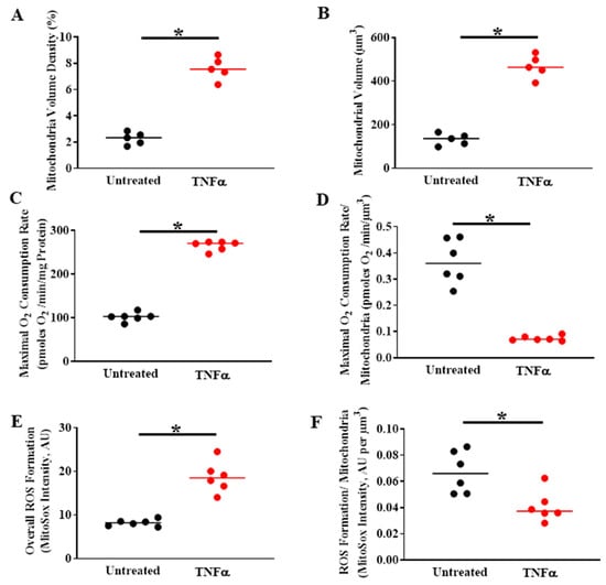 In human ASM cells, TNFα exposure (20 ng/mL, 24 h) increases (A) mitochondrial volume density per cell and (B) and the total mitochondrial volume and (C) overall maximum mitochondrial O2 consumption rate (measured using Seahorse) (D) maximum O2 consumption rate when normalized for mitochondrial volume density, O2 consumption rate per mitochondrion (i.e., normalized for) is reduced; (E) overall ROS formation measured using MitoSox; (F) however, when normalized for mitochondrial volume density, this increase in ROS is mitigated. (* denotes a significant difference between TNFα treated and untreated control groups; p < 0.05; t-test; cells were dissociated from ASM samples from n = 5 patients and divided into TNFα treated and untreated control groups). All data are presented as scatter plots with the lines indicating the mean values. These figures are modified from presentations of previously reported results [].