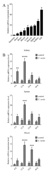 The expression of CsGal-8 in tongue sole tissues with and without bacterial infection. (A) CsGal-8 mRNA expression in the gill, kidney, spleen, muscle, liver, blood, brain and heart of tongue sole was determined by real-time-quantitative PCR (RT-qPCR). The expression levels are presented relative to that in intestine. (B) Tongue sole were infected with or without (control) Edwardsiella tarda for different hours, and the expression of CsGal-8 in blood, kidney and spleen was determined by RT-qPCR. Values are the means of three experimental replicates and shown as means ± S.D. ** p < 0.01, *** p < 0.001, **** p < 0.0001.