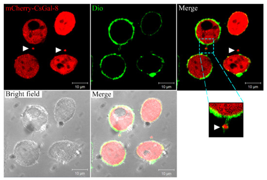 Intracellular distribution of CsGal-8. mCherry-tagged CsGal-8 was expressed in HeLa cells and observed with a confocal microscope. mCherry-tagged CsGal-8 was in red color and cell membrane was in green color after staining with DiO. Extracellular vesicles containing mCherry-tagged CsGal-8 are indicated by arrowheads.