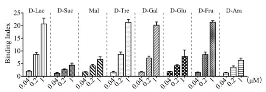rCsGal-8 (Figure S3) was purified from E. coli and examined for carbohydrate binding capacity. As shown in Figure 4, rCsGal-8 bound to different carbohydrates in a dose-dependent manner. rCsGal-8 exhibited relatively high binding activities towards lactose, trehalose, galactose, and fructose, and low binding activities to sucrose, maltose, glucose, and arabinose (Figure 4).
