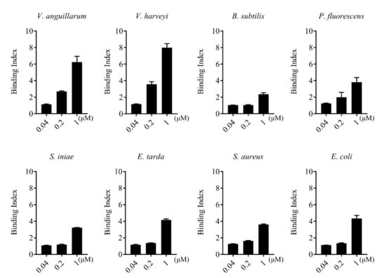Bacteria binding ability of rCsGal-8. The binding of different concentrations of rCsGal-8 to different bacteria (Vibrio anguillarum, Vibrio harveyi, Edwardsiella tarda, Streptococcus iniae, Pseudomonas fluorescens, Staphylococcus aureus, Escherichia coli, and Bacillus subtilis) was determined by ELISA with PBS as a control. Values are the means of three experimental replicates and shown as means ± S.D.