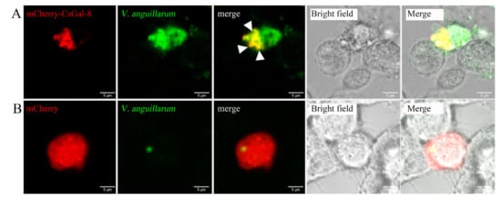 Co-localization of CsGal-8 with Vibrio anguillarum. RAW264.7 cells transfected with the vector expressing mCherry-tagged CsGal-8 (A) or the backbone vector (B) were incubated with FITC-labeled V. anguillarum for 2 h. The cells were then observed with a confocal microscope. Co-localization of CsGal-8 and V. anguillarum is indicated by arrowheads.