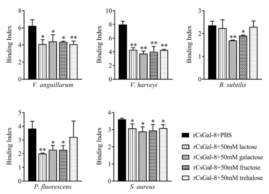 Inhibition effects of different carbohydrates on rCsGal-8 binding to bacteria. rCsGal-8 was pre-incubated with lactose, galactose, fructose, trehalose, or PBS (control), and the binding to different bacteria (Vibrio anguillarum, Vibrio harveyi, Pseudomonas fluorescens, Staphylococcus aureus, and Bacillus subtilis) was determined by ELISA. Values are the means of three experimental replicates and shown as means ± S.D. * p < 0.05, ** p < 0.01.