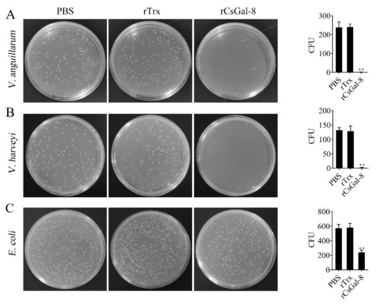 The bactericidal activity of rCsGal-8. V. anguillarum (A), V. harveyi (B) and E. coli (C) were incubated with 1 μM rCsGal-8 or rTrx or PBS (control) for 1 h. The bacteria were plated on LB plates and incubated for 12 h. The number of colony-forming unit (CFU) was counted and shown on the right panels. Values are the means of three experimental replicates and shown as means ± S.D. ** p < 0.01.