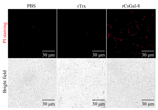 Propidium iodide staining analysis of bactericidal activity of rCsGal-8. Vibrio anguillarum were incubated with 1 μM rCsGal-8 or rTrx or PBS (control) for 30 min. Following the 30 min incubation, bacteria were stained with propidium iodide and observed under a fluorescence microscope.
