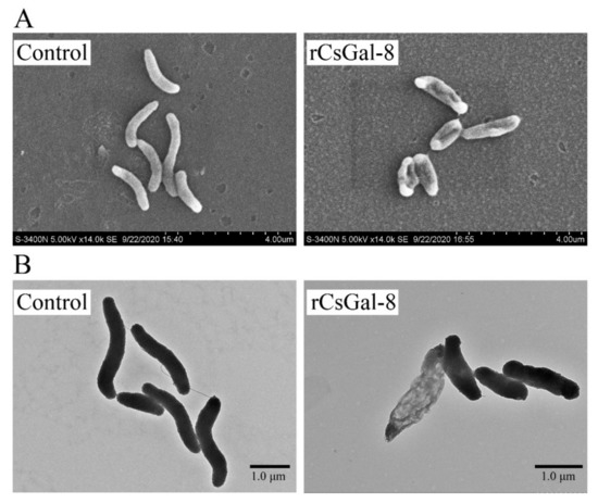 Ultra-structural analysis of rCsGal-8-treated Vibrio anguillarum. V. anguillarum was incubated with 1 μM rCsGal-8 or PBS (control) for 30 min and then examined with scanning electron microscopy (A) and transmission electron microscopy (B).