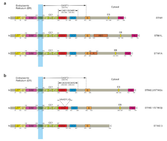 Domain structure of stromal interaction molecule (STIM) proteins. (a) Primary structure of STIM1 and its isoforms STIM1 Long (STIM1L) and STIM1A. Functionally relevant domains within the endoplasmic reticulum (ER) luminal portion include the canonical (cEF) and noncanonical (nEF) EF hands as well as the sterile alpha motif (SAM). Downstream of the transmembrane domain (TM), the cytosolic portion contains three coiled coil (CC) domains commonly known as CC1, CC2, and CC3 with CC1 being further subdivided into α1, α2, and α3. The C-terminal fragment spanning all three CC domains is termed Orai-activating small fragment (OASF). Another fragment comprising CC2 and CC3 is named CRAC-activating domain (CAD) or STIM-Orai-activating region (SOAR). Further C-terminal domains include the inactivation domain (ID or ID-STIM), the microtubule end-binding domain (EB), and the polybasic domain (PBD) at the outermost C-terminus. STIM1L and STIM1A feature the same general structure but each harbor an additional C-terminal domain inserted downstream of the ID domain by alternative splicing. STIM1L thereby includes an actin-binding domain (ABD) while STIM1A possesses an insert designated as domain A. (b) Primary structure of STIM2.2/STIM2α and its isoforms STIM2.1/STIM2β and STIM2.3. For reasons of simplicity, the 87 amino acid N-terminal signal peptide insertion of STIM2.2 and its isoforms was omitted from this display [43,44,45]. Due to the high degree of similarity between STIM1 and STIM2.2, their functional domains are essentially equivalent. Alternative splicing leads to inclusion of a small 8 amino acid insert (VAASYLIQ) within the CC2 domain of STIM2.1 and to an upstream end of translation in case of STIM2.3, shortening the protein by 148 amino acids. Otherwise, both STIM2.1 and STIM2.3 correspond to STIM2.2.