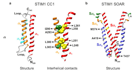 In terms of structural resolutions, another STIM1 NMR fragment that partially overlaps with the CC1 structure has been reported by Stathopulos and coworkers in 2013 [54]. Termed CC1[TM-distal]–CC2, the fragment comprises the CC1α3 and CC2 domains (Figure 1a) and was resolved both in the presence and absence of Orai1 C-terminus. The authors were able to observe differences in double α-helix intertwining between the Orai1-free and Orai1-bound states. Furthermore, they suggest a mechanism for STIM1–Orai1 C-terminus coupling in the CRAC complex assembly. The reported STIM1–Orai1 interactions were experimentally confirmed by patch clamp electrophysiology [54]. Further along the C-terminus, the STIM1 SOAR domain has also been resolved by X-ray crystallography in 2012 (Figure 1a and Figure 2b) [52]. A triple mutant (L374M, V419A, and C437T) was used to create the crystal in this case. SOAR was reported to have an R-shape created by the antiparallel orientation of CC2 and CC3 and divided into four helices: Sα1, Sα2, Sα3, and Sα4. The first and the last of these helices correspond to CC2 and CC3 with Sα2 and Sα3 being two small helices in between them. Furthermore, the authors identified SOAR as a dimer and found interaction between the N- and C-terminal regions of the monomers (Figure 2b) [52].