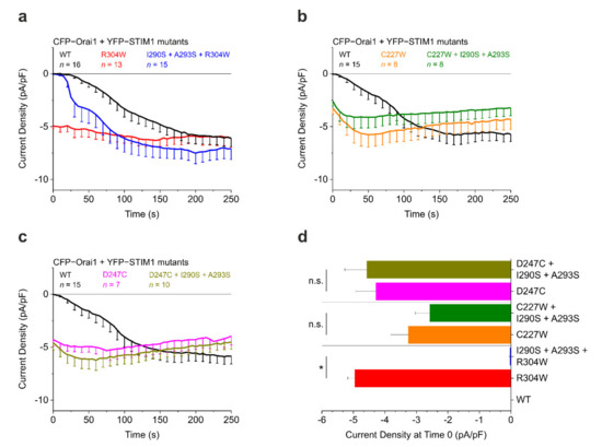 The prominent effect of the newly identified CC1 interhelical contact mutations on the Stormorken STIM1 R304W mutant observed with patch clamp electrophysiology (Figure 3a,d) and various FRET assays [22] raises the question whether these mutations can also overrule other STIM1 GoF mutants that are neither directly part of the CC1α1–CC3 binding interface nor of the interhelical contacts and thus principally do not preclude clamp formation. Here, we report the first experimental results for STIM1 C227W, a TM domain mutant [16], as well as for STIM1 D247C, which is situated in the STIM1 coiled coil zipping region [12] as part of ongoing functional studies. In patch clamp electrophysiology experiments (according to the method published in [22]) with HEK293 cells co-expressing CFP–Orai1 and YFP–STIM1, the C227W mutant showed robust constitutive Orai1 current activation. The combination of C227W with the I290S + A293S double mutation to create STIM1 C227W + I290S + A293S did not elicit any significant change in the constitutive Orai1 current activation behavior (Figure 3b). Similarly, STIM1 D247C induced strong constitutive Orai1 currents that were not altered in experiments using the triple mutant STIM1 D247C + I290S + A293S (Figure 3c). Thus, I290S + A293S was only able to significantly abolish or reduce constitutive currents induced by STIM1 R304W and not by the other two tested GoF STIM1 mutants C227W and D247C (Figure 3d).
