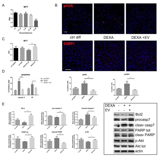 About this kind of damage, we monitored the staining with p53 binding protein 1 and pH2A, since 53BP1 plays a role early in the DNA damage response pathway and acts downstream of H2AX [43]. The EV incubation prevented the increase of these markers induced by DEXA, protecting HOB from DNA damage. Furthermore, all the apoptosis markers were positively modulated by EV pretreatment.