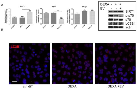 Effect of AFSC-EV supplementation on autophagic pathway of HOB treated or not with Dexamethasone. (A)—Western blot analysis of total lysate of HOB cells treated or not with AFSC-EV in the presence of DEXA, then revealed with anti-SIRT1, anti-p-p70, anti-p70, and anti-LC3β antibodies. The graphs represent the mean ± SD of densitometric analysis of three experiments, normalized to actin values. ** p value < 0.01; *** p value < 0.001; **** p value < 0.0001. (B)—Representative images with DAPI (blue) and LC3β (red) signals of HOB cells incubated or not with DEXA and EV are shown. Scale bar = 10 µm.
