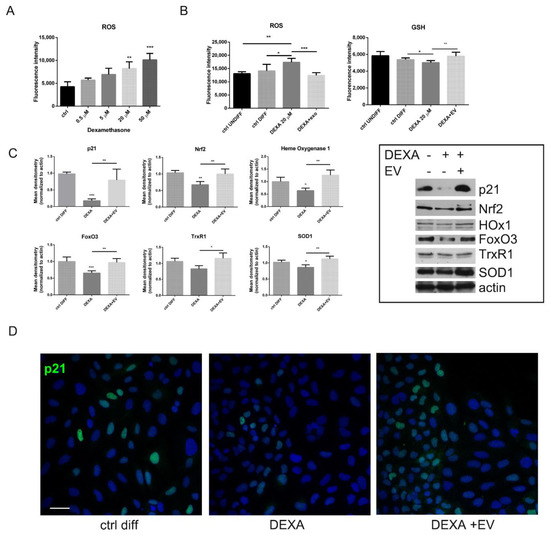 Effect of AFCS-EV supplementation on reactive oxygen species (ROS) modulation in HOB treated or not with Dexamethasone. (A)—Graph showing ROS assay of HOB cells treated with increasing concentration of DEXA. ** p value < 0.01; *** p value < 0.001. (B)—ROS and GSH content was measured with fluorescent probes, after AFSC-EV exposure and DEXA treatment. * p value < 0.05; ** p value < 0.01; *** p value < 0.001. (C)—Western blot analysis of total lysate of HOB, treated or not with AFSC-EV, then exposed to DEXA. Immunoblot were performed with the indicated primary antibodies. The graphs represent the mean ± SD of densitometric analysis of three experiments, normalized to actin values. * p value < 0.05; ** p value < 0.01; *** p value < 0.001. (D)—Representative images with DAPI (blue) and p21 (green) signals of HOB cells incubated or not with DEXA and EV are shown. Scale bar = 10 µm.