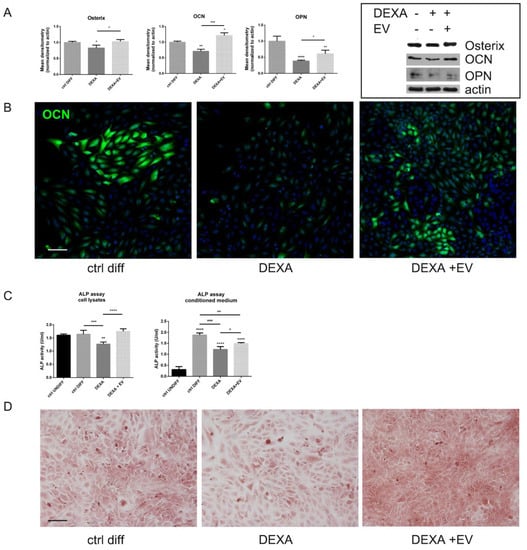 All these considerations can justify the pro-differentiation effect of AFSC-EV observed both in undifferentiated and under differentiation HOB cells as well. Indeed, the inhibitory effect of DEXA on osteogenesis was shown by the reduction of cell viability, decrease of ALP activity, and suppression of osteogenesis-related protein expression including ALP, OPN, and OCN.