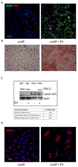 Moreover, since we previously found in the AFSC-EV proteome analysis [29] the presence of Galectin-3 binding protein, the levels of Galectin-3, as osteoblast modulating protein [30], was investigated. Western blot analysis and IF images demonstrated that the amount of Galectin-3 is dramatically higher in nuclei of HOB exposed to EV (Figure 5C,D), as suggested by proteomic analysis.