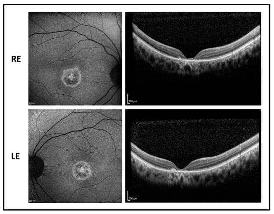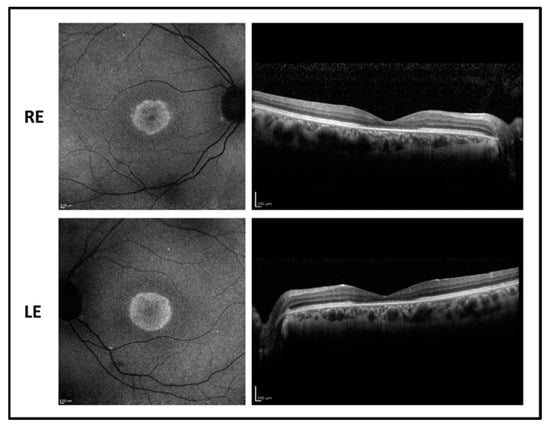 Fundus autofluorescence (left side) and OCT (right side) images of the right eye (RE) and left eye (LE) of patient 3 showing hyperfluorescent macular area with foveal hypofluorescence and central macular thickness reduction with foveal photoreceptor disruption.