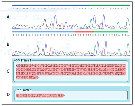 Sequence chromatograms of the wild-type mRNA (A) and the c.76-9A > G variant (B). The blue bar represents a portion of Exon 1, the green bar a portion of Exon 2, the red bar shows the retention of a 8nt sequence caused by the splicing variant in intron 1. Below, the wild-type amino acid sequence (C) and the predicted shorter sequence translated from the mutant mRNA (D). Pink shading represents the open reading frame, bold red letters identify Methionine residues or start codons.
