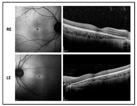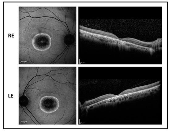 The 16-year-old male patient reported poor vision and photophobia since the age of 4. BCVA was 0.4 LogMAR in RE and 0.52 LogMAR in LE with a refractive error of −5.75 sph −3.00 cyl/15° D in RE and of −6.00 sph −3.50 cyl/170° D in LE. The fundus examination showed normal optic disk, a loss of the foveal reflex, and peripheral RPE mottling. Fundus autofluorescence revealed a central hypofluorescence with a mild perifoveal hyperfluorescent area in both eyes while OCT imaging showed a foveal photoreceptor disruption associated with a normal central macular thickness and relative sparing of paracentral retina (Figure 6). Flash full-field ERG recordings showed reduced responses mostly for the photopic component. Visual fields display a central scotoma.