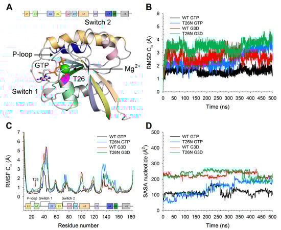 (A) The three-dimensional structure of GTP-bound Rab-28 is shown as cartoon, Mg2+-ion is shown as a green sphere, GTP is represented as sticks with C atoms in white, N atoms in blue, O atoms in red, and P atoms in orange, residue T26 is shown as magenta sticks with the O atom highlighted in red. The P-loop and the Mg2+ ion are indicate by black arrows. Inset shows the coloring scheme for secondary structure elements. (B) Time evolution over 500 ns of the Cα-RMSD of GTP-bound wild-type (WT) (black), GTP-bound T26N (blue), G3D-bound WT (red), G3D-bound T26N (green) Rab-28. (C) Cα-RMSF profiles of GTP-bound WT (black), GTP-bound T26N (blue), G3D-bound WT (red), G3D-bound T26N (green) Rab-28. Inset shows secondary structure elements colored according to panel A, the position of residue 26 on the secondary structure representation is marked with a red arrow and labeled. (D) Time evolution over 500 ns of the SASA of guanine-nucleotide of GTP-bound WT (black), GTP-bound T26N (blue), G3D-bound WT (red), G3D-bound T26N (green) Rab-28. Data was smoothed using a moving average over 1 ns window as described in the methods section.