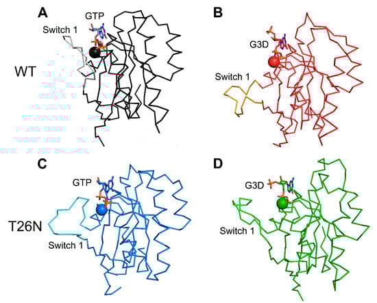(A) Comparison of the three-dimensional structure of (A) GTP-bound WT (black), (B) GTP-bound T26N (blue), (C) G3D-bound WT (red), and (D) G3D-bound T26N (green) Rab-28 after 500 ns MD simulations. Protein structure is shown as a ribbon connecting Cα atoms, Mg2+-ion is represented as a sphere colored with the same color as the protein structure, GTP/G3D are represented as sticks with N atoms in blue, O atoms in red, and P atoms in orange and labeled. The switch 1 region of each state is highlighted with a lighter hue of the protein structure color and labeled.