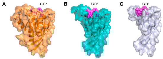 (A) Three-dimensional structure of GTP-bound WT Rab-28, protein structure is represented as an orange cartoon, Mg2+-ion is shown as an orange sphere, GTP is displayed as magenta sticks, the molecular surface of each element is shown in transparency and colored accordingly. (B) Three-dimensional structure of GTP-bound p.(Arg137*) Rab-28, protein structure is represented as a teal cartoon, Mg2+-ion is shown as a teal sphere, GTP is displayed as magenta sticks, the molecular surface of each element is shown in transparency and colored accordingly. (C) Three-dimensional structure of GTP-bound p.(Trp107*) Rab-28, protein structure is represented as a light blue cartoon, Mg2+-ion is shown as a light blue sphere, GTP is displayed as magenta sticks, the molecular surface of each element is shown in transparency and colored accordingly. The GTP molecule shown in panels (B,C) is merely for representation purposes, as both truncated forms would not allow the correct folding of the binding pocket.