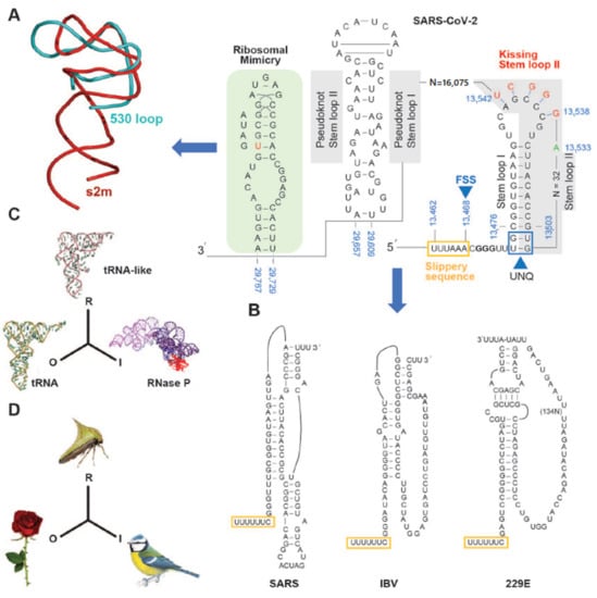 Sequences within the SARS-CoV-2 genome are involved in ribosomal frameshifting and RNA stem-loop structural formation. (A) The predicted standard coronavirus heptanucleotide shift site U_UUA_AAC is present and shown with the slippery sequence (brown box) and frame shift site (FSS) followed by a guanine conservation sequence (bold). An unpaired G:U nucleotide quartet (UNQ: boxed) may offer stability to the stem loop I and II. Binding between the stem loops and a downstream nucleotide region (13,538–13,542 bp) results in “kissing” stem loop II formation. A variant in SARS-CoV-2 (13533C->A) compared to SARS-CoV is indicated. Potential pseudoknot stem loops occur between 29,609–29,657 bp (grey box). Conservation element s2m (stem-loop II motif, pale green box) is shown that may partake in 16S ribosomal RNA macromolecular mimicry. Ribbon diagram (left of arrow) showing the similarity in the backbone folds between the s2m structure (red) and the 530 loop of the 16S rRNA (blue). (B) Sequence and base-pairing of three different coronavirus stimulatory elements; SARS three-stemmed pseudoknot [24,25], the avian infectious bronchitis virus (IBV) two-stemmed pseudoknot [26], and the kissing loops of the human coronavirus 229E stimulatory element [17]. The heptameric slippery sites are shown (yellow rectangles). (C,D) Models of mimetic relationships corresponding to the representamen: R, the model to the object: O and the operator to the interpretant: I [27]. A molecular example (C): the tRNAPhe is considered to be the object, the untranslated end of the plant virus TYMV genome is the representamen, while the interpretant is the tRNA precursor processing enzyme RNase P Modified from [23]. In (D), the plant’s thorn is the object, the thorn bug is the representamen and the predatory bird that the prey eludes is the interpretant. Modified from [23].