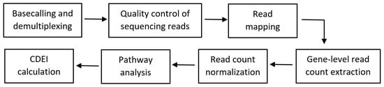 The bioinformatics workflow for the CDEI calculation is shown in Figure 2. Basecalling and demultiplexing were done using the CASAVA v.1.9 pipeline (Illumina, San Diego, CA, USA). The quality of the sequencing reads was assessed using FastQC v0.11.5 (https://www.bioinformatics.babraham.ac.uk/projects/fastqc/). The base qualities were over 30 on the Phred scale across all of the samples and no adapter contamination was noted. The reads were mapped to the human genome (GRCh37, Ensembl) downloaded from the Illumina iGenomes repository (https://support.illumina.com/sequencing/sequencing_software/igenome.html). The mapping was done using HISAT v2.0.5 [32] with the following command “hisat2-q—rna-strandness R—phred33-p 20—known-splicesite <known_splice_sites> -x <index> -U <fastq> -S <sam>”. The number of reads mapping to features (genes) was calculated using FeatureCounts v.1.6.1 [33], with the following command “featureCounts -T 20 -s 2 -a <genes.gtf> -o <counts> <sam>”.